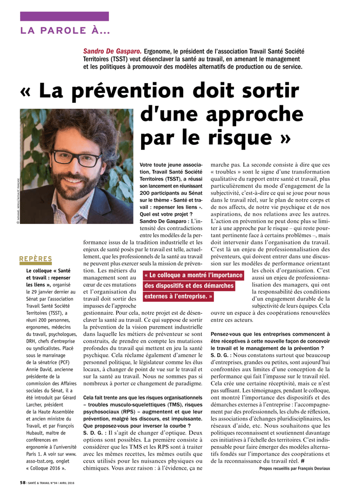 Pour ce faire, l’association soutient et développe des initiatives de réflexion et de débat. Elle cherche également à faire émerger de nouveaux dispositifs favorisant la coopération et la professionnalisation des différents acteurs et métiers concernés (professionnels de la santé au travail, managers, responsables d'organisations syndicales et professionnelles, élus politiques), à différentes échelles et en articulant les différents plans (individus, entreprises, territoires, société).